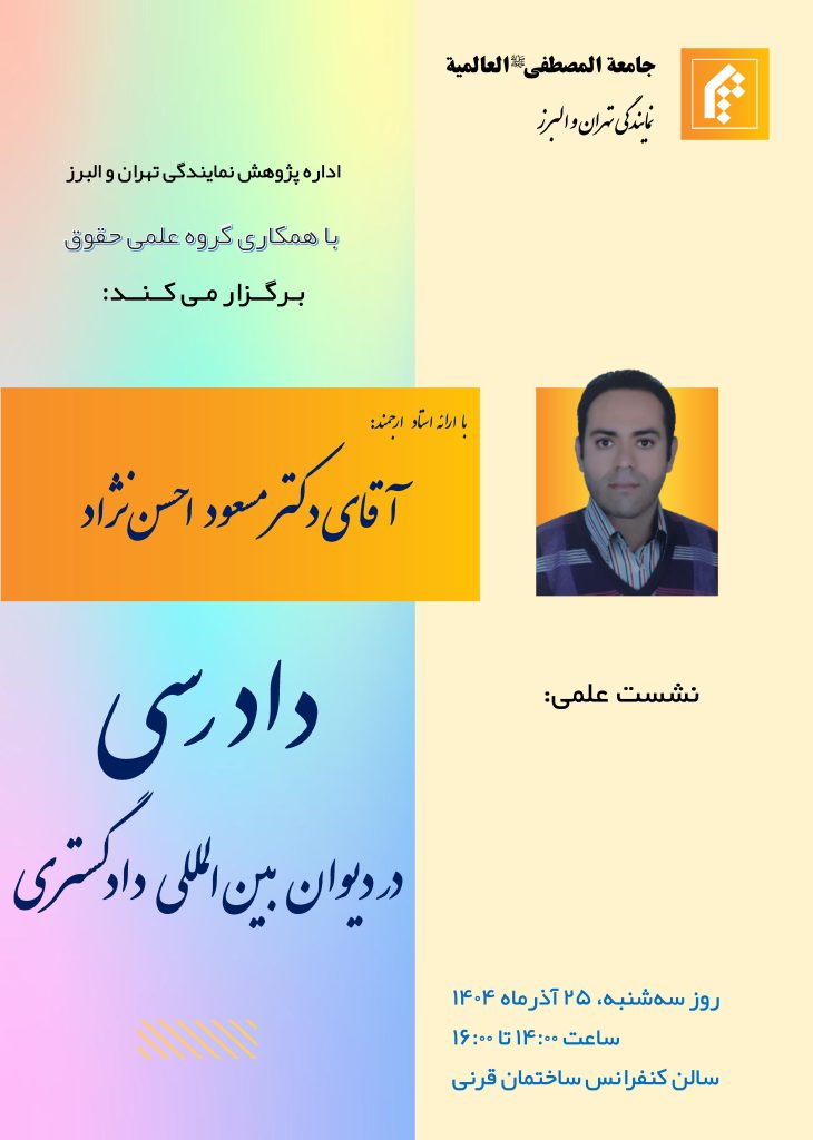 نشست علمی: «دادرسی در دیوان بینالمللی دادگستری» با سخنرانی استاد ارجمند: آقای دکتر مسعود احسننژاد روز سهشنبه، ۲۵ آذرماه ۱۴۰۴، ساعت ۱۴تا ۱۶ در سالن کنفرانس ساختمان قرنی