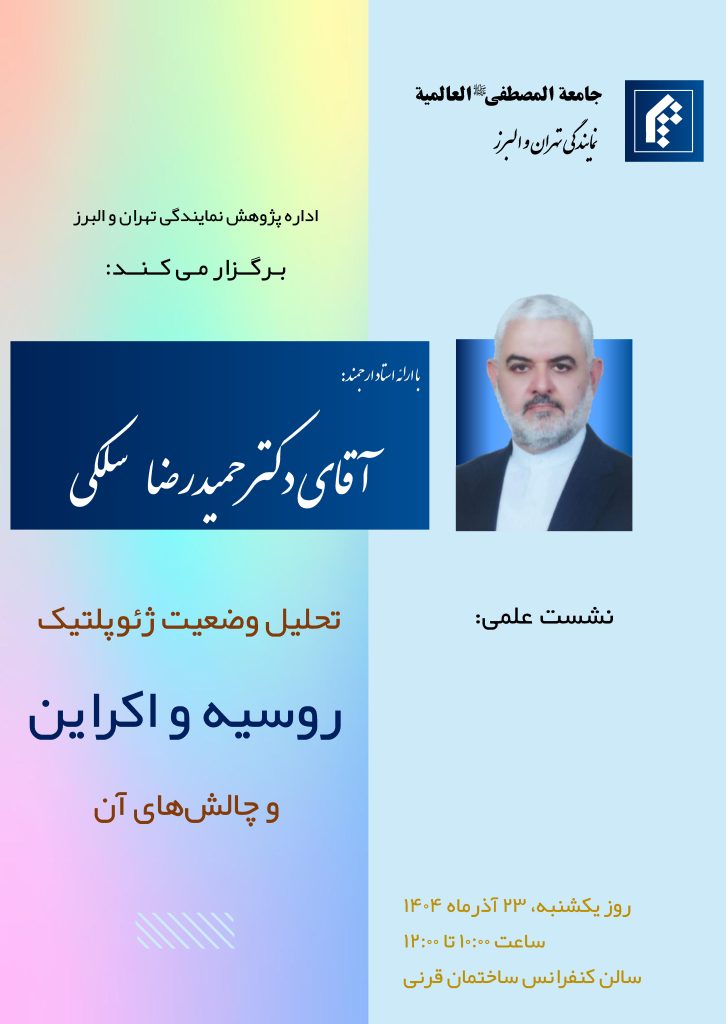نشست علمی: «تحلیل وضعیت ژئوپلتیک روسیه و اوکراین و چالشهای آن» با سخنرانی استاد ارجمند: حجةالاسلام و المسلمین آقای حمیدرضا سلکی روز یکشنبه، ۲۳ آذرماه ۱۴۰۴ ساعت ۱۰:۰۰ تا ۱۲:۰۰…