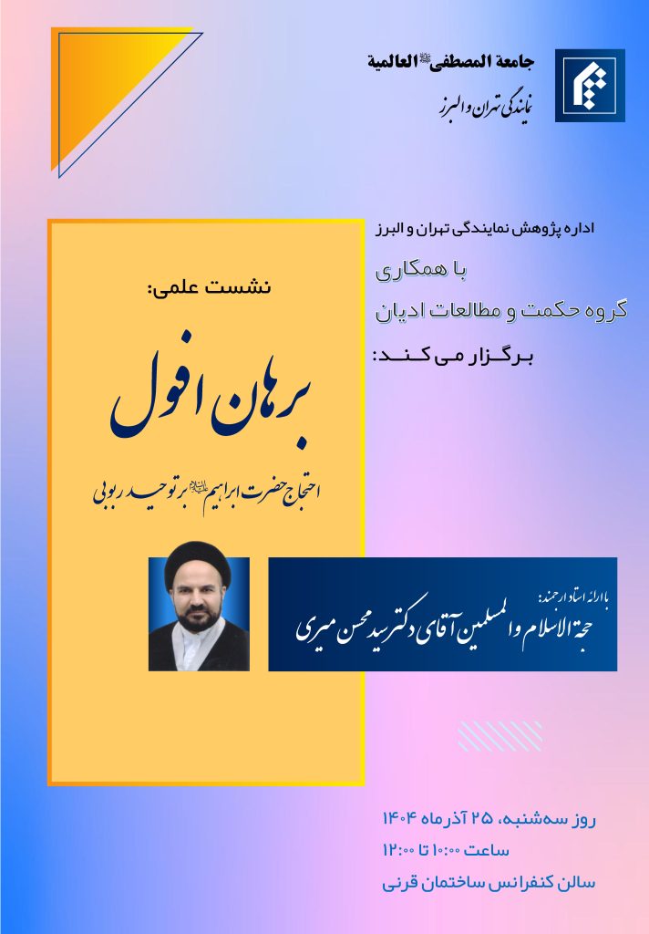 نشست علمی: «برهان افول – احتجاج حضرت ابراهیم (ع) بر توحید ربوبی» با سخنرانی استاد ارجمند: آقای دکتر سیدمحسن میری روز سهشنبه، ۲۵ آذرماه ۱۴۰۴، ساعت۱۰:۰۰ تا ۱۲:۰۰ در سالن…